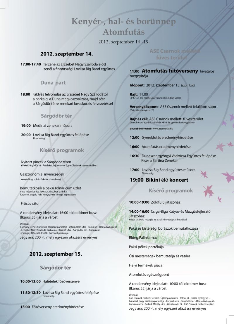 Személy szerint nagy kedvencem ez a mini fesztivál, hiszen ilyenkor minden a kenyérről, a halról és a borról szól. A legfinomabb paksi halászleveket kóstolhatjuk meg, amit aztán paksi illetőleg tolna megyei borokkal lehet "leöblíteni". ;)